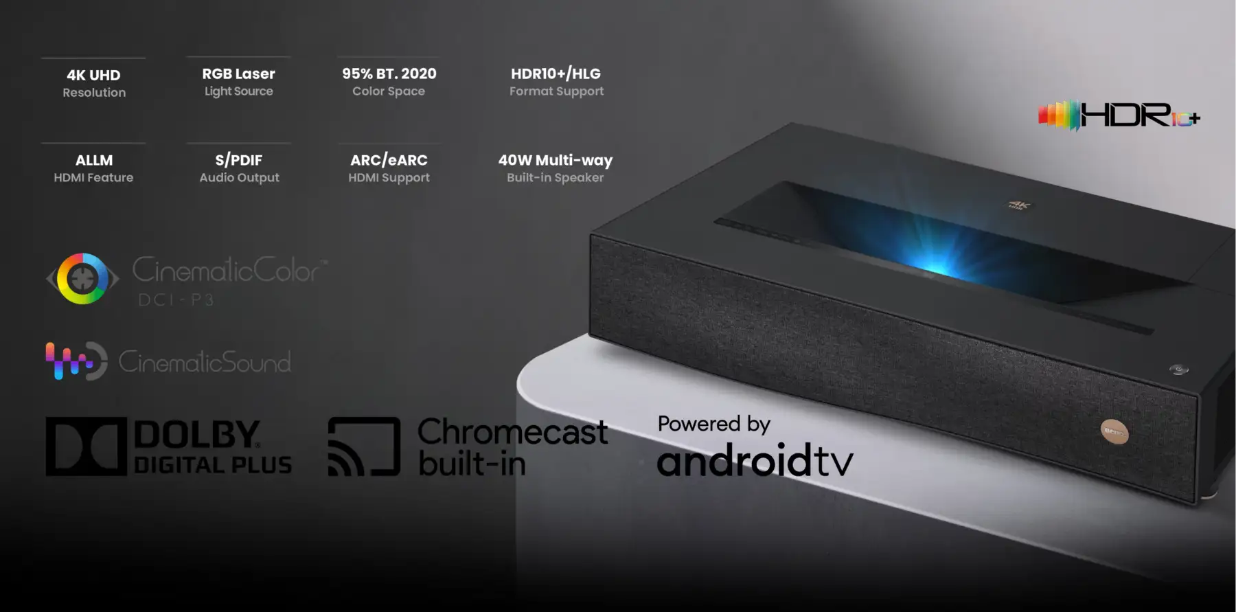 BenQ V5010i ultra kısa mesafe RGB lazer TV projektörü, salonunuzu sadece birkaç santimetre mesafeden konumlanarak dev bir sinema ekranına dönüştürür. 0.25 atım oranı sayesinde perdeye çok yakından yerleşir; 2.500 ANSI lümen parlaklık ve lazer ışık kaynağının 20.000 saatlik ömrüyle ortam aydınlatmasında dahi net görüntü sunar. RGB Lazer ışık kaynağıyla birlikte (ışık kaynağı karartması etkin) 2.500.000:1’e varan kontrast değeri, derin siyahlar ve parlak zirveler sağlar.