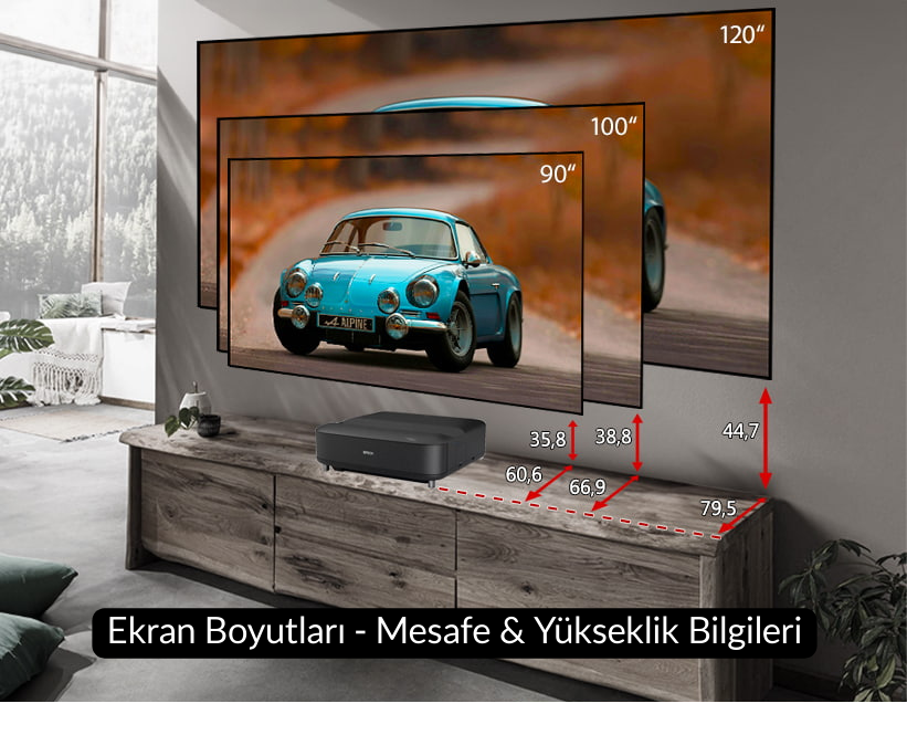 120" e kadar dev görüntüleri ultra kısa projeksiyon mesafesinden yansıtabilirsiniz.